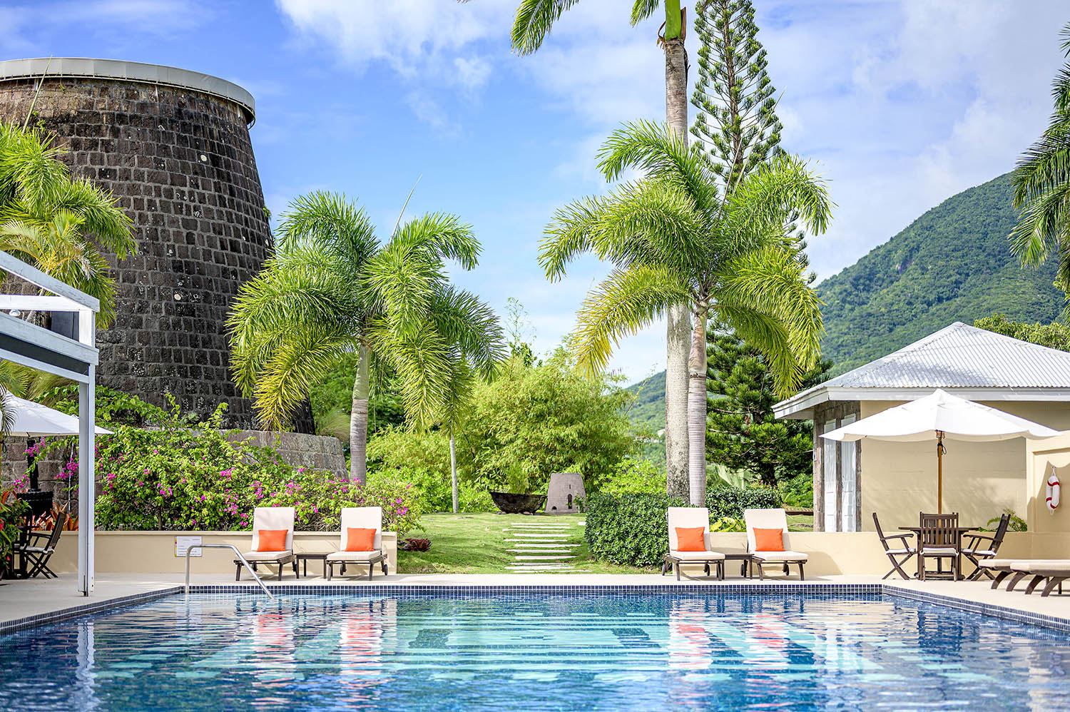 The hotel’s exterior, too, gleams softly beneath the Nevis sun, refreshed landscaping highlighting the island’s natural contours while inviting moments of quiet reflection.